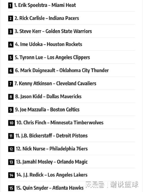而美媒也给各队主帅,进行了相关排名。其中勇士主帅科尔仅次于斯波和卡莱尔,进入了榜单前三名。湖人雷迪克作为菜鸟教练,上赛季才正式出山,所以他仅排在第14位,倒也没有太大问题,甚至可以说美媒够客气了。