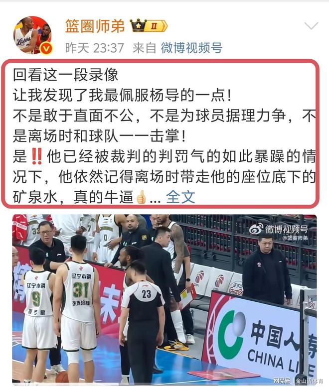 “篮圈师弟”:“回看这一段录像,让我发现了我最佩服杨导的一点!不是敢于直面不公,不是为球员据理力争,不是离场时和球队一一击掌!他已经被裁判的判罚气的如此暴躁的情况下,他依然记得离场时带走他的座位底下的矿泉水,真的牛逼。”。