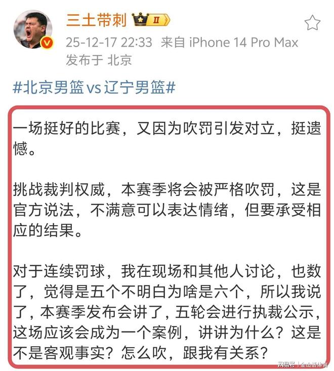 “三土带刺”:“一场挺好的比赛,又因为吹罚引发对立,挺遗憾。挑战裁判权威,本赛季将会被严格吹罚,这是官方说法,不满意可以表达情绪,但要承受相应的结果。对于连续罚球,我在现场和其他人讨论,也数了,觉得是五个不明白为啥是六个,所以我说了,本赛季发布会讲了,五轮会进行执裁公示,这场应该会成为一个案例。”。