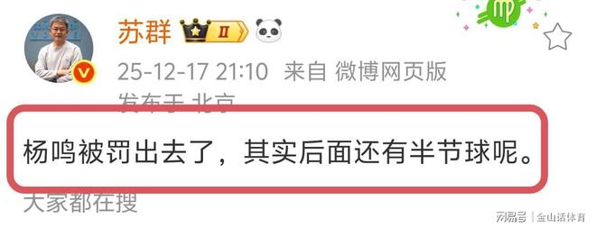苏群:“杨鸣被罚出去了,其实后面还有半节球呢。”。而当有粉丝向及北京队罚了6次球时,苏群回应道“我也没看明白,三个T罚球和两个犯规罚球完了,还罚了一个。”。